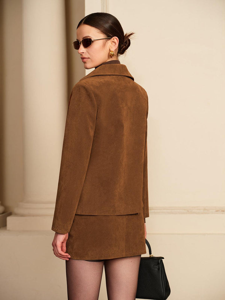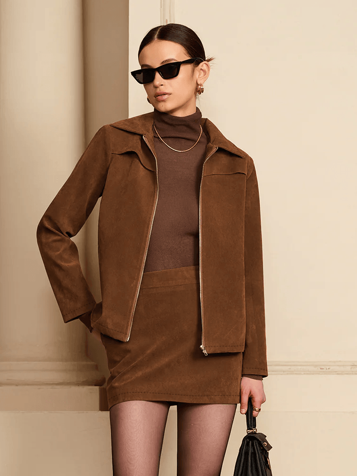 Velvet Elegance Ceket ve Etek Takımı, modern çizgilerle zamansız bir şıklığı bir araya getiren eşsiz bir tasarımdır. Yumuşak süet dokusuyla rahatlığı ve elegan bir görünümü bir arada sunarken, şehir stilinin zarafetini yansıtır. Minimal detaylarla güçlendirilmiş bu takım, günlük kombinlerden özel davetlere kadar çok yönlü kullanım imkânı sağlar.