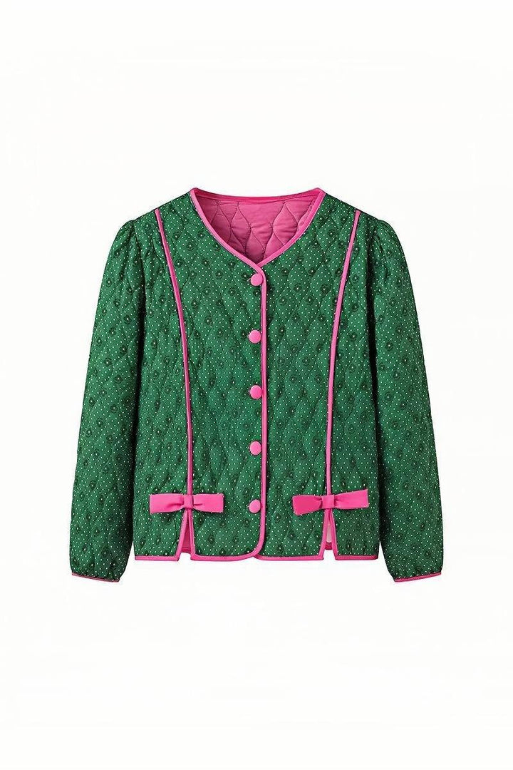 Bu büyüleyici kapitone ceket, rahat konforu şık ayrıntılarla birleştiren keyifli bir parçadır. Sevimli noktalı çiçek baskısı, kadınsı ve ilginç bir dokunuş katan eğlenceli fiyonk aplikleriyle tamamlanıyor. Kontrast kaplama genel görünümü geliştirerek cekete tamamlanmış ve parlak bir görünüm kazandırır. Ceketin yeşil rengi, taze ve canlı bir his katıyor; gündelik bir gün veya şık bir akşam için mükemmel.