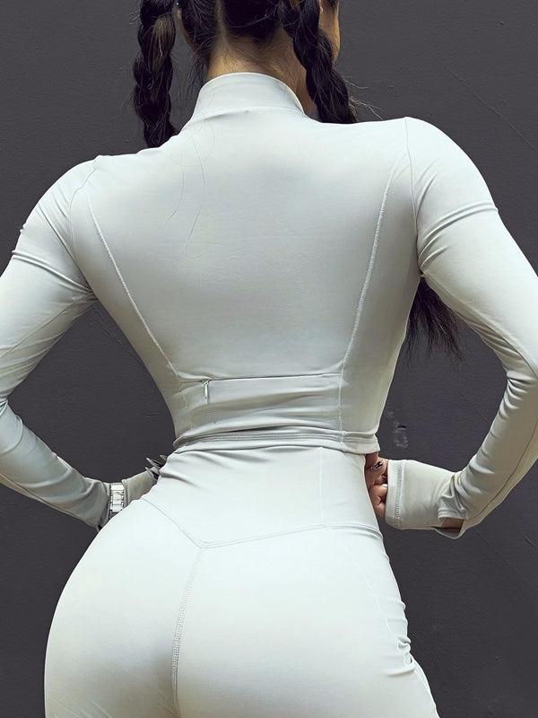 Kadın Fermuarlı Cepli Kısa Uzun Kollu Tişört - Parmak Deliği Detayı