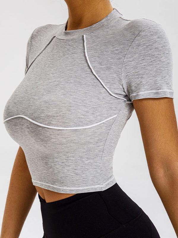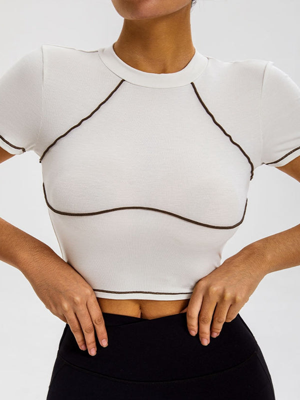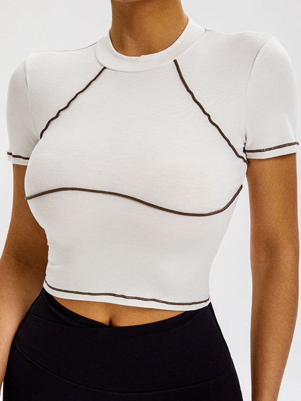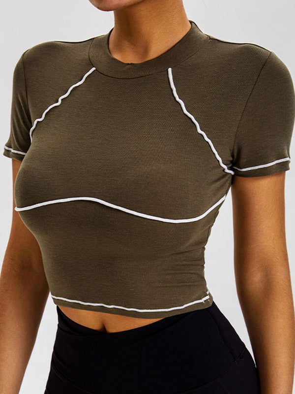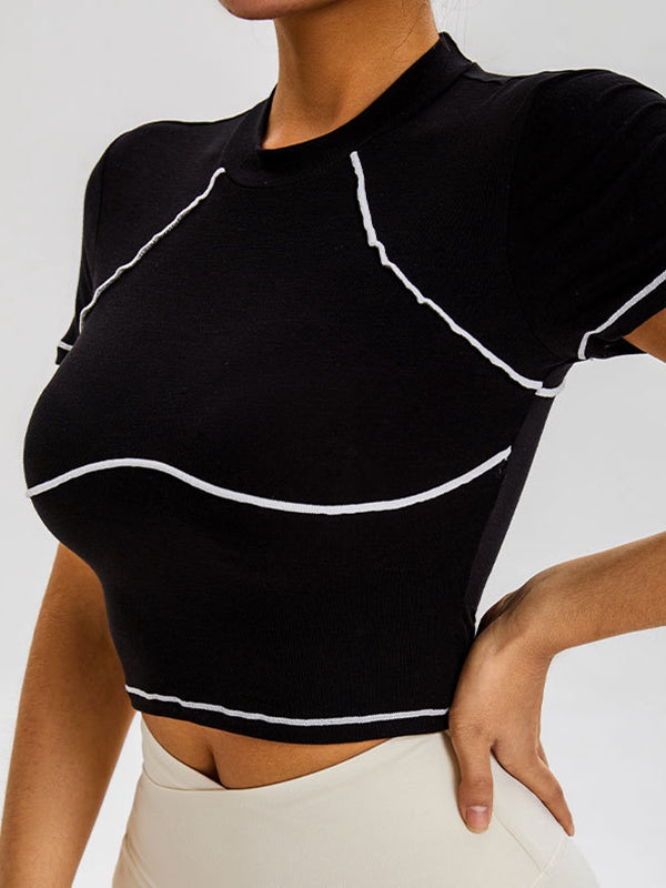 Kadın Şık Kontrast Renkli Çizgili Yüksek Bel Kısa Kollu Bluz