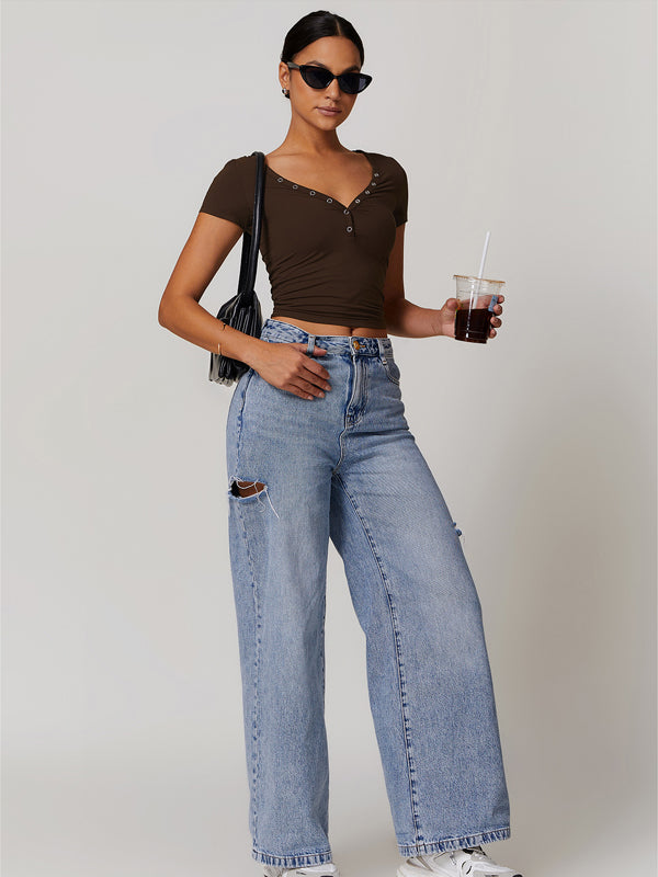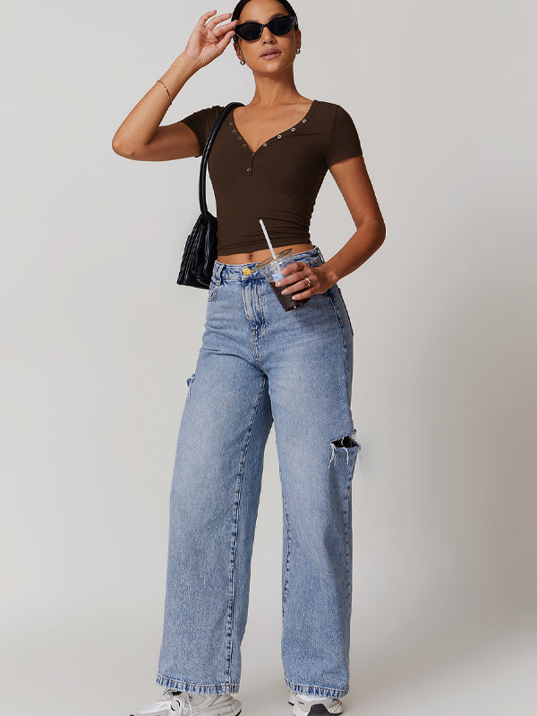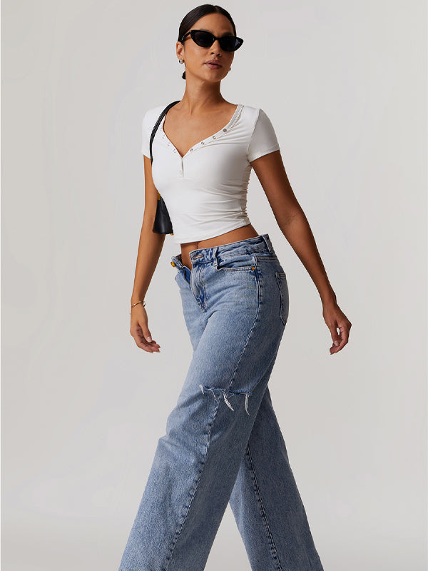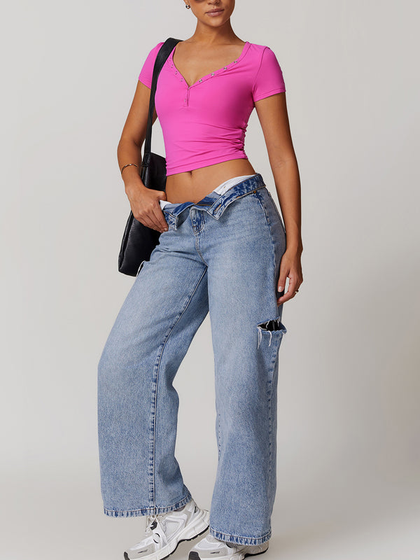 Kadın V Yaka Hızlı Kuruyan Düğmeli Kısa Kollu Yoga Üstü